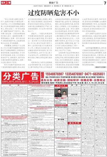 过度防晒可能会影响机体的调节功能。日光中的可见光、紫外线和红外线,都具有很强的生物学作用。当日光照射机体时,能通过视觉分析器和皮肤感受器,作用于中枢神经系统,经复杂的作用调整人体各组织器官的功能,对睡眠、心血管等系统有调节、保护的作用,进而促进身体健康。从头裹到脚的防晒隔绝了阳光,也可能会影响身体的调节功能。年轻人以为自己在抗老,但身体内部在发生另一种人为导致的老化。