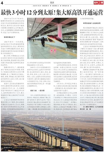 记者从中国铁路呼和浩特局集团有限公司了解到,集大原高铁开通首日至2025年1月4日,铁路部门将开行呼和浩特东至山西省太原南、大同南高铁动车组列车3对,呼和浩特与太原间运行时间将缩短至最快3小时12分。