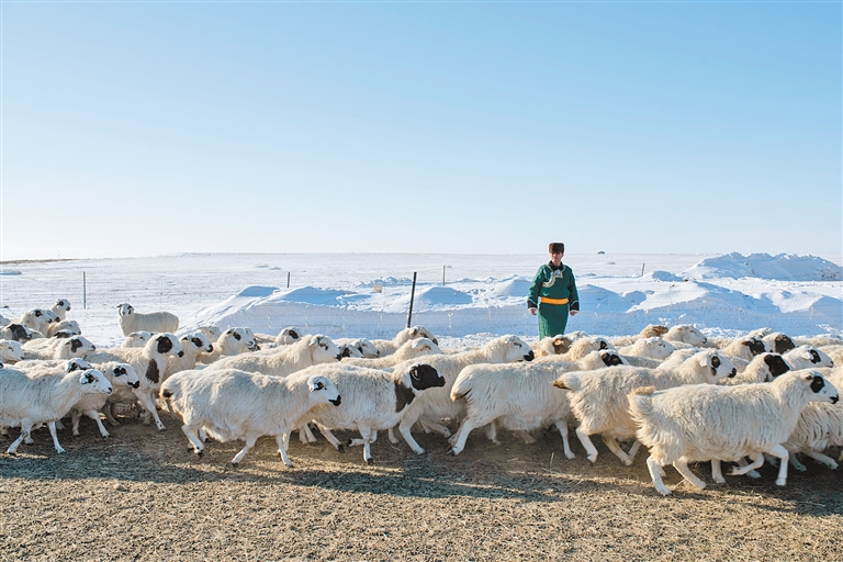 12月18日,在锡林郭勒盟东乌珠穆沁旗,牧民正在打理羊群。近年来,东乌珠穆沁旗坚持以“3+2”产业为主体,推进畜牧业转型升级。其中,为全面做好乌珠穆沁羊选育提高工作,巩固提升“种羊场-扩繁场-核心群-标准化畜群”乌珠穆沁羊四级联合育种体系,着力抓好种业提升工作,2022年以来,共完成乌珠穆沁羊选种选配116万只,人工受精母羊4万只,鉴定种公羊30202只,育成种公羊鉴定3015只,建成核心群290群,完成肉羊生产性能测定9126只。