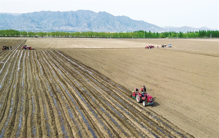 5月8日,呼和浩特市土默特左旗农民正在播种玉米。呼和浩特气象、农牧部门建议,当前全市大部土壤墒情较好,各地要抢抓晴好天气,尽快开展玉米抢墒播种工作。播种前施足基肥,调试检修机械。同时气象部门提醒,近期大风天气较多,土壤失墒快,已播种玉米地块要压实地膜,防止大风截膜。 本报记者 怀特乌勒斯 摄