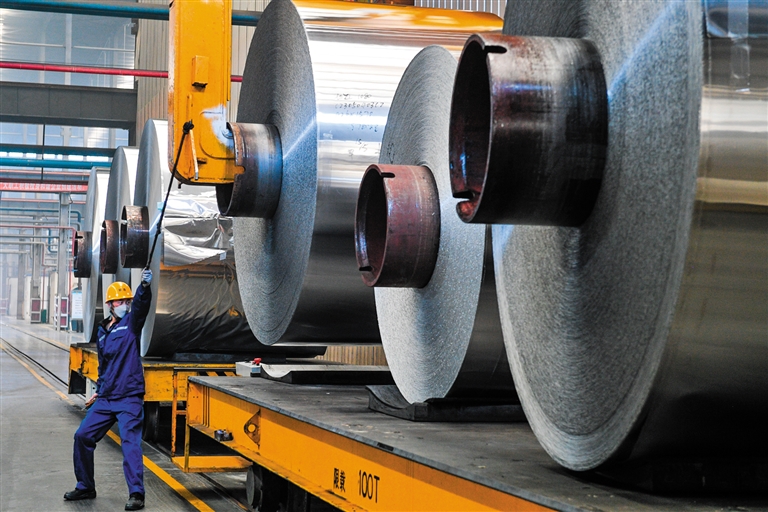 5月16日,通辽市霍林郭勒市的内蒙古联晟新能源材料公司内,工人在高端铝箔生产线上操作机械臂作业。近年来,霍林郭勒市立足区位优势,持续优化铝产业结构,做足做好铝产业链延链、补链、强链“文章”,瞄准高端铝箔、高性能铝合金、高纯铝、汽车轻量化铝材等方向,手握“拳头产品”,为推动绿色低碳铝基新材料产业高质量发展注入强劲动力。本报记者 王晓博 摄