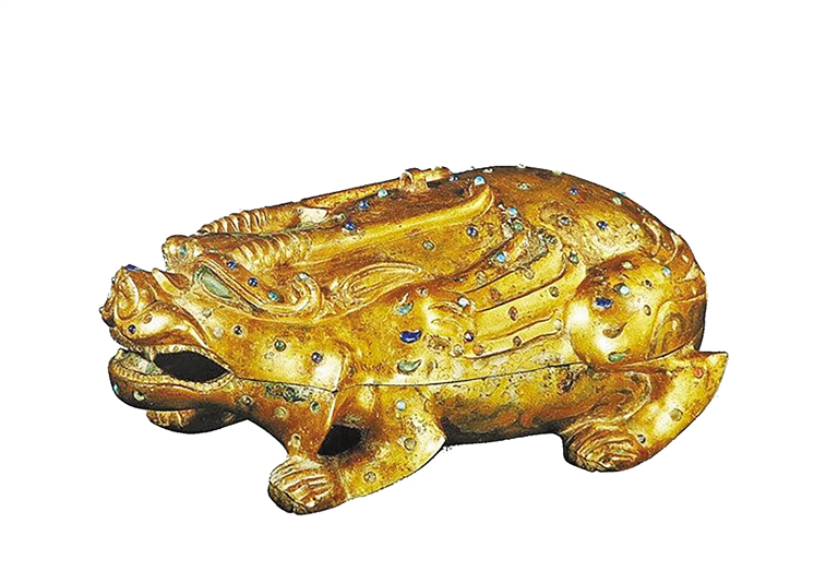 点评:秦汉以来,古人对蟾蜍颇为敬畏,认为它是镇凶邪、助长生的吉祥物。《太平御览》引《关中记》记载:“蟾蜍头生角,得为食之,寿千岁,又能食山精。”文中砚盒的制造者,在保证石砚使用功能的情况下,又利用当时较为发达的金属工艺,制成随形的兽形砚盒,各色宝石使砚盒金碧辉煌。其器身所嵌各种宝石千年不变色、不脱落,保存至今仍然熠熠生辉,是汉代鎏金与镶嵌工艺的完美结合。