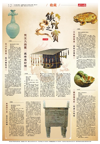 渊源:砚为文房四宝之一,汉代刘熙所著《释名》中解释:“砚者研也,可研墨,使和濡也。”汉代以前很长时间,砚的制作只注重实用性。到了汉代,人们才开始关注砚台的装饰性,不仅制砚的材料多种多样,而且琢磨更细致,有的还配上精美的砚盒。自此,砚史发展进入实用性与艺术性相结合的新阶段,文中东汉镶嵌兽形铜砚盒就是典型代表。