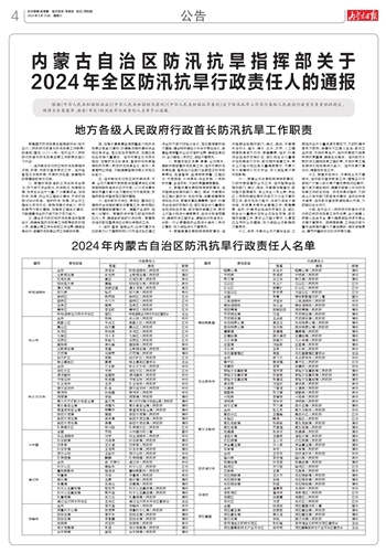 内蒙古自治区防汛抗旱指挥部关于 2024年全区防汛抗旱行政责任人的通报