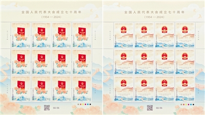 这是整版的《全国人民代表大会成立七十周年》纪念邮票(拼版照片)。9月15日,中国邮政发行《全国人民代表大会成立七十周年》纪念邮票1套2枚,邮票图案名称为弘扬宪法精神、发展全过程人民民主。全套邮票面值2.40元。新华社发