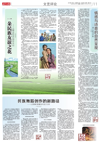民族舞蹈创作积极探索当下人与人、人与社会之间的真实情感。舞蹈中众多新的尝试,是编导瞄准“当下”,使选材更具日常性、当下性,是对当下生活的观察与思考。作品中用手机恋爱的青年、用手机向世界宣传美丽家乡的新牧民,流露出信息时代真实的生活场景,这正是多民族、多地域人民相互交流融合的体现,是一种开放的、现代的民族元素与现实题材相融合的审美格局。