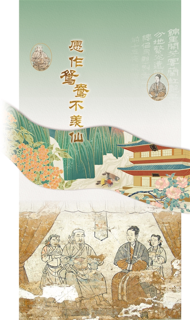 《夫妻对坐图》描绘的不是墓主人升天的场景,而是更注重世俗趣味。墓主夫妻二人相对坐于帷帐下,观赏歌舞表演。绘制者根据墓主人的身份、志趣、品位,乃至当时的潮流,为其“个性化定制”相应的内容,描绘墓主人生前夫妻和睦,愿作鸳鸯不羡仙的情感,再现世俗人间烟火,旨在营造一座热闹、温馨的“吉宅”,庇佑他们的后人安康富庶。