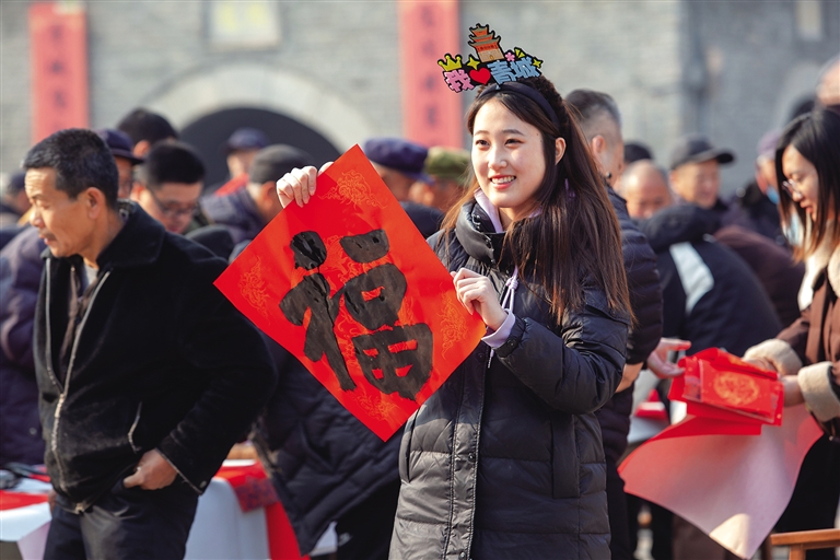 1月21日,在山东省淄博市高青县举办的“黄河大集”送福进万家活动现场,市民在展示刚刚领到的福字。新春临近,各地举行写春联、写福字活动,书法爱好者挥毫泼墨为广大市民送去祝福。 新华社发