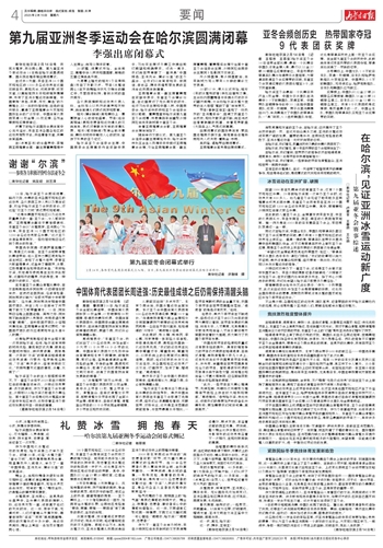 第九届亚洲冬季运动会在哈尔滨圆满闭幕