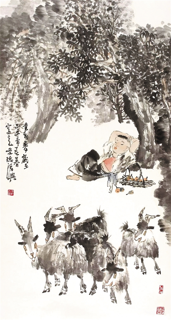 张峻德的这类作品和前者有异曲同工之妙,只是画中的环境从草原转到了“西梁”(他曾经生活工作过的鄂尔多斯乡村),画中的人物由牧民变成了农民。这类作品,以对人物形象的成功塑造和生动夸张的表现,以及富有魅力的笔墨语言而引人入胜。张峻德善于在富有个性的生活场景和丰富的生活细节中塑造人物,老农、村童、山羊、老树、南瓜、葫芦、柿子等的组合,展现了西部乡村的田园生活,富有动人的意趣。