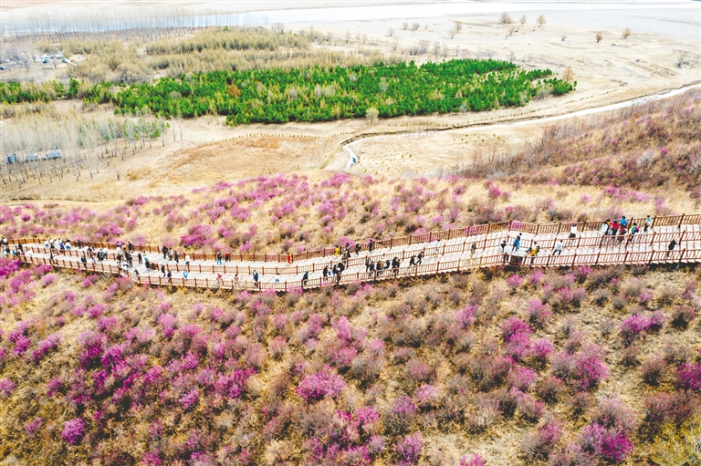 4月26日,扎兰屯市映山红生态公园翠屏山杜鹃花竞相绽放,吸引游客赏花游玩。当地的野生杜鹃花每年4月下旬至5月上旬开放,花期20天左右。近年来,扎兰屯市催热“赏花经济”,变生态优势为发展优势,让“绿水青山”同时成为“金山银山”,实现生态与经济双赢。 本报记者 王晓博 摄