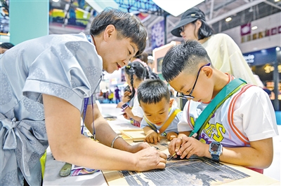 版画创作者现场指导小朋友学习扎鲁特版画雕刻技艺。