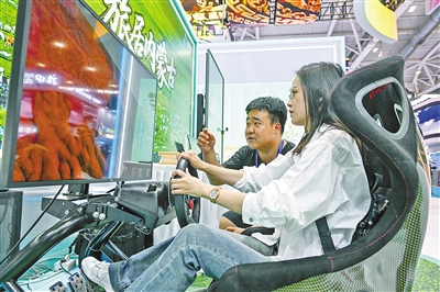 参会者体验“风驰北疆”AR实景沉浸式体验项目,通过模拟驾驶领略内蒙古壮美风光。