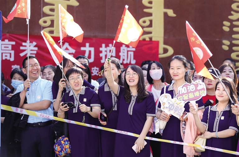 当日,记者在三十四中考点看到,送考老师和家长或手拉横幅,或身穿旗袍,或手捧鲜花,用各种方式为考生加油鼓劲。