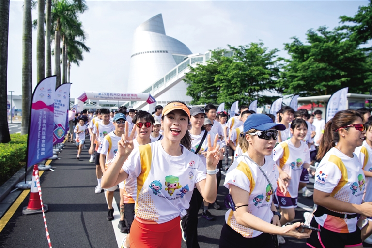 6月11日,群众在欢乐跑活动中。当日,亚运会欢乐跑活动在澳门科学馆前地广场举行,700多名参与者共同为喜迎亚运会“助跑”。摄影/新华社记者 张金加