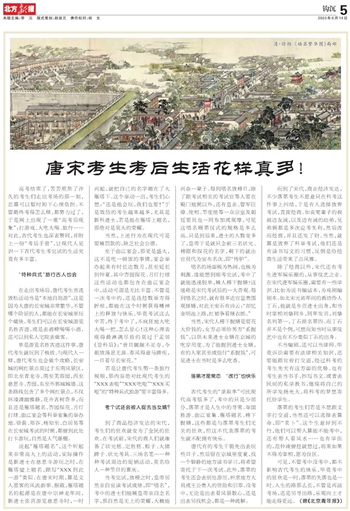 可见,不管考中没考中,都不影响古代考生的快乐,毕竟考中的狂欢是一时,落第的失落也是一时。人生的路那么长,不管是再战考场,还是另寻出路,乐观向上才能走得更远。(据《北京青年报》)