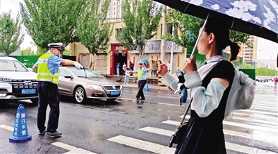 6月26日7时30分,降雨天气给中考生出行带来诸多不便。呼和浩特市交管支队新城区大队五中队的交警们在雨中坚守岗位,引导车流顺畅通行,成为呼和浩特市第三十四中学考点一道靓丽的风景。(相关报道见4版)