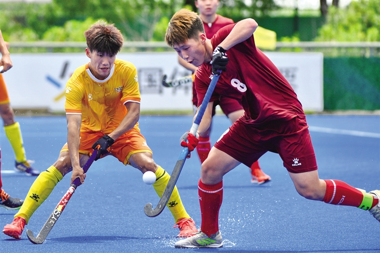 7月4日,呼和浩特队球员郭悦明(右)在比赛中与沈阳队球员李鹏飞拼抢。当日,在江苏常州武进曲棍球训练基地举办的第一届全国学生(青年)运动会(公开组)曲棍球男子决赛阶段比赛中,呼和浩特队以1:5不敌沈阳队。摄影/史 康