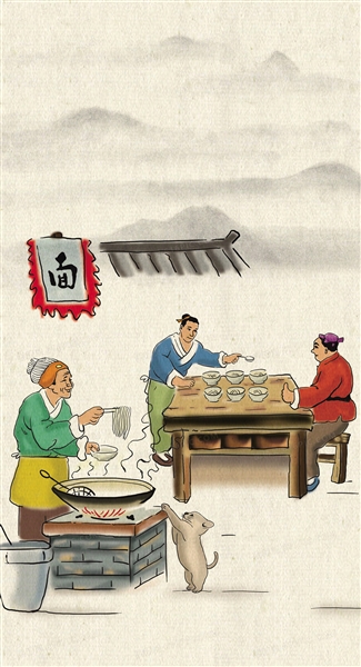 饷面多食于野,不择地、择屋,吃法无拘,不束吃相。不值工钱的小活儿,比如行夯、压栈、上梁、缝缀之类锦上添花又确实需要人手的活计,忙完了,主家酬谢一下大家,吃一碗面,多有油炸糕相食,也谓之饷饭。丧事上添手搭力,这碗面又称“过桥面”。过桥面有讲究,肉重、汤厚、碗大,浇头味稠。平时称臊子,这时称浇头,也称挠。大挠就是大肉大酒,意思里也隐含了尊重与善待。