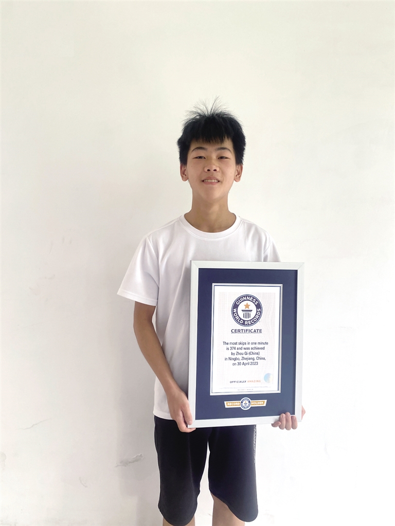 周琦前后两次挑战吉尼斯世界纪录。第一次,他因所用的绳子不合规,成绩被判定无效。随后,经过沟通,周琦很快完成了第二次尝试。挑战时,他的双脚像装了马达,手上的绳子飞快地转动着,取得了一分钟单摇374次的成绩,打破了日本选手保持10年的吉尼斯世界纪录,较前纪录超出26次。拿到吉尼斯世界纪录证书的那一刻,周琦十分兴奋,“跳绳让我不断突破自我,感觉好棒!”