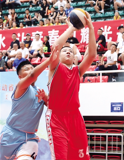 7月27日,呼和浩特领胜篮球俱乐部球员(右)突破上篮。当日,由内蒙古篮球协会主办的2023年内蒙古自治区小篮球联赛暨中国小篮球系列活动省级赛在内蒙古师范大学(赛罕校区)体育馆开幕。本次赛事延续了往年的公益性质,以在全区推广小篮球为主要目的,共30余支球队参赛,均是通过各盟市小篮球赛事选拔晋级。