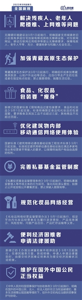 9月,一批重要新规开始施行:推进无障碍设施建设,让残疾人、老年人生活“无碍”;规范化妆品网络经营;对困难群体的保障更加有力……法治更进步,生活更美好。(据《人民日报》)