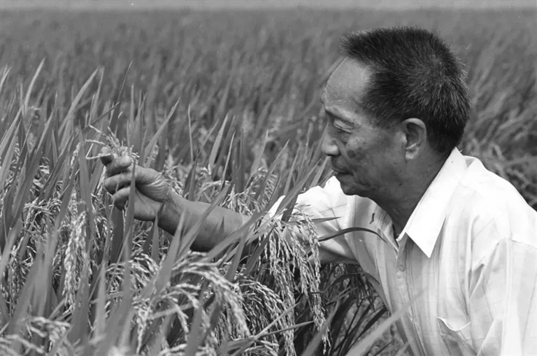 袁隆平教授在观察两系法杂交晚稻结实情况(资料图片)