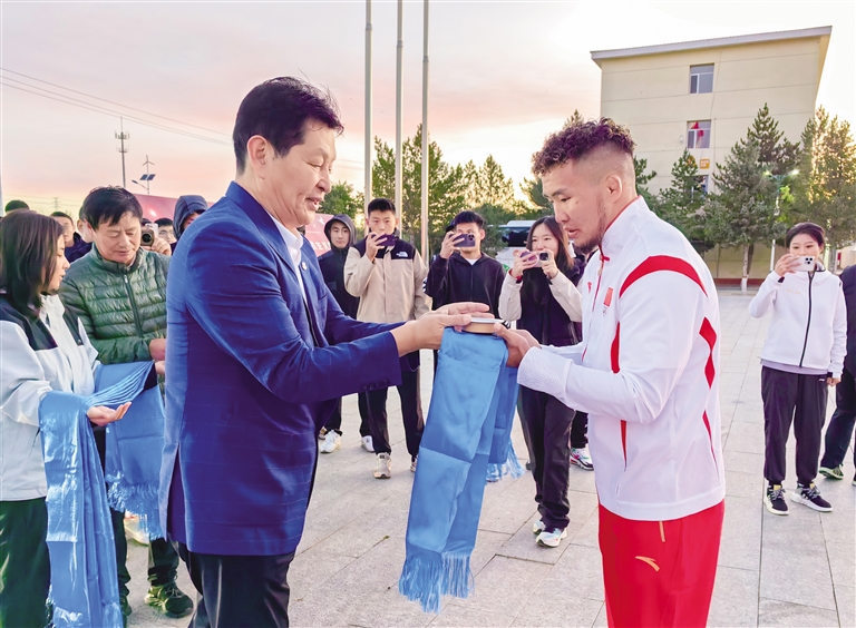 9月20日清晨6时许,内蒙古体育局竞体处处长朝鲁为男子柔道运动员青达嘎献上哈达。当日,中国男子柔道队5名运动员从武川出发前往杭州参加亚运会,其中内蒙古的青达嘎和布和毕力格分别参加73公斤级和90公斤级的角逐,他们将于9月25~26日登场亮相。摄影/草原全媒·北方新报首席记者 牛天甲