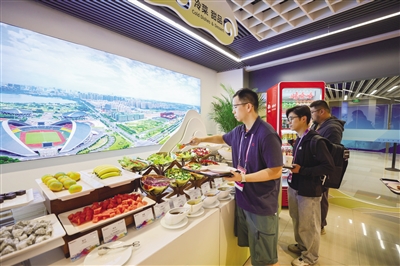 在杭州亚运会主媒体中心,用于接待媒体记者与工作人员的用餐区设置在负一楼,面积约1万平方米,设有餐位近2000个。为了让大家都能在这里享受到一场“舌尖上的盛宴”,餐厅从氛围营造到菜品布置都费了不少心思。