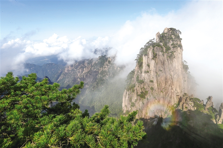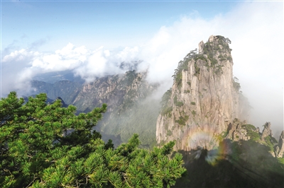 9月25日在安徽省黄山市黄山风景区拍摄的云海景观。 当日,雨后初霁的安徽省黄山风景区出现秋日迷人的蓝天云海,在阳光的照耀下,彩虹般的光晕在云海中若隐若现,与奇峰相映成趣。(据新华社报道)