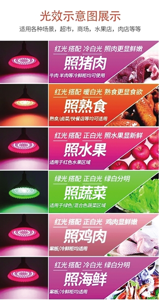 记者在一家销售“生鲜灯”的网店上看到,灯的款式有多种,不仅针对肉类,还可以根据需求提供灯光搭配方案:一般来说,猪肉灯是红光搭配冷白光,熟食灯是红光搭配暖白光,水果灯是红光搭配正白光,蔬菜灯是绿光搭配正白光,鸡肉灯是红光搭配正白光,冷鲜柜则用冷白光。根据店面大小不同,卖家还提供安装位置以及灯泡度数。由于度数不同、材质及是否有调节亮度颜色等功能,“生鲜灯”价格也不同,便宜的10多元,贵一点的会卖到200多元。