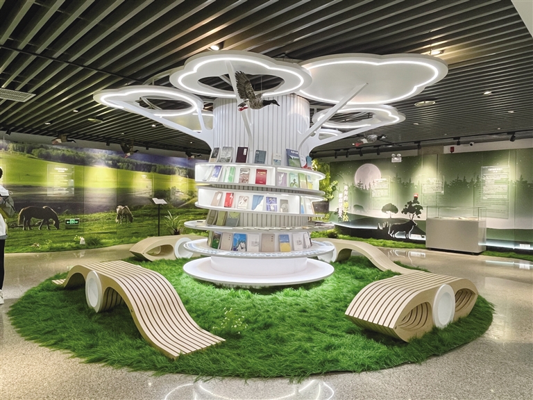 展览以壮美雄阔的内蒙古自然风光为背景,分为草原、森林、水系、沙漠、新能源五个部分,以38段精彩的文字节选和近百本书籍,结合实物造景和VR、投影等数字展览手段,展示水草丰美、山川秀丽的美好内蒙古,展示人与自然万物和谐共生的生态内蒙古,展示绿色发展、风光无限的科技内蒙古。文学的“绿意盎然”勾勒出生态文明的“诗意画卷”,展示出内蒙古作家在记录“美丽中国”的进程中,浓郁的地域特色和独特的审美表达。