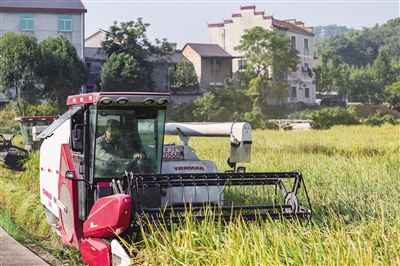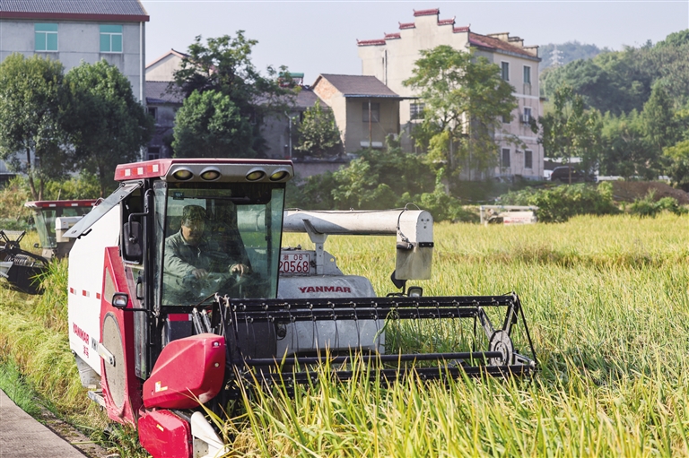 10月18日,在诸暨市苍湖粮食专业合作社的水稻田里,收割机在收割水稻。秋收时节,浙江省诸暨市陶朱街道推行“企业+合作社+农户”专业化粮食生产加工一条龙模式,指导农户抢抓天气晴好的有利时机,加快秋收进度,提高秋收效率,确保粮食颗粒归仓。摄影/新华社记者 徐 昱