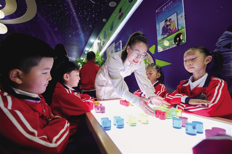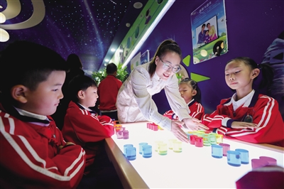 10月27日,呼和浩特市赛罕区南门外小学昭乌达南路分校老师在校园科技馆内为学生上课。当日,由自治区道德模范、内蒙古昕海铭悦运输有限公司总经理杨岭爱心捐赠的“星空顶”校园科技馆亮相,该馆设计独特,科技感满满,配备了多种科普仪器、科技原理文字解说图片等,可以让孩子们探索科技的奥秘,激发学习科技的兴趣。全息屏则是应用3D全息互动投影技术,将科技和教学内容巧妙地融合在一起,赋予课堂奇妙体验。摄影/草原全媒·北方新报首席记者  牛天甲