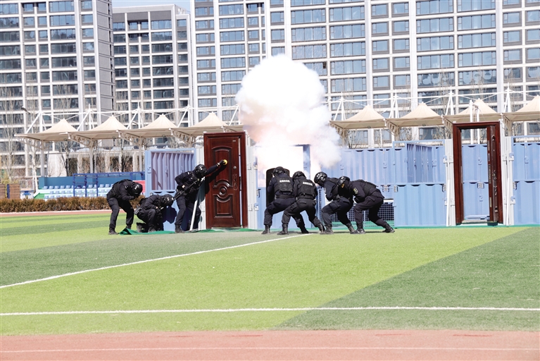 10月27日,呼和浩特市公安局举办“抓强整树创一流 筑牢屏障保安全”2023应急处突拉动演练暨练兵比武。市局反恐怖和特巡警支队及9个旗县区公安(分)局反恐怖和特巡警大队500余名警力响应指令,准时参演。突击车、运兵车、狙击平台车等特种车辆,穿墙雷达、排爆机器人等新型警用装备也列阵参加了演练。图为建筑物突击攻坚战术演练。
