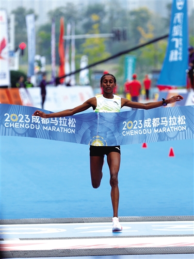 成都马拉松赛巴林选手戈萨冲向终点。最终,她以2小时26分46秒的成绩夺得女子马拉松冠军。