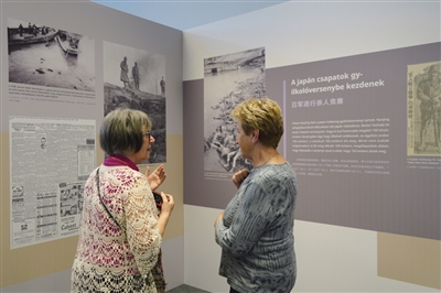10月30日,观众在匈牙利布达佩斯参观《世界记忆、和平愿景——南京大屠杀史实展》。当日,由侵华日军南京大屠杀遇难同胞纪念馆主办的《世界记忆、和平愿景——南京大屠杀史实展》在匈牙利首都布达佩斯民族学博物馆开幕。摄影/新华社记者 陈 浩