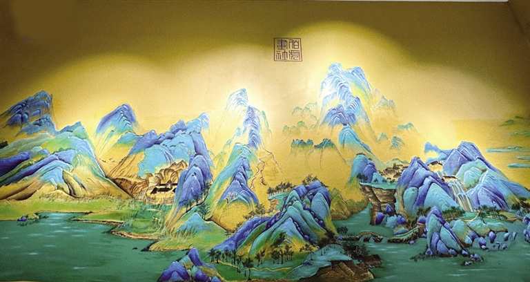 段老师介绍,创作这幅壁画最难的环节是调色,“从绘制线稿到制作浮雕,一个多月就完成了,剩下两三个月都是在调色。”段老师说,原画使用的是矿物颜料,而浮雕壁画需要使用丙烯画颜料,“国画颜料适用于在宣纸或绢上作画,要上墙就不能用这种颜料。想要还原山水的石青、石绿等颜色,还是有一定难度。我们都是在试错中试出来的。”