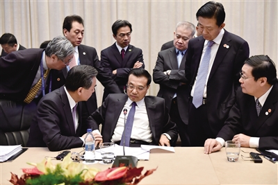 | 2014年12月16日,李克强同志在贝尔格莱德出席第三次中国-中东欧国家领导人会晤。这是会谈间隙,他与随行部长进行会商。(新华社供稿) |
