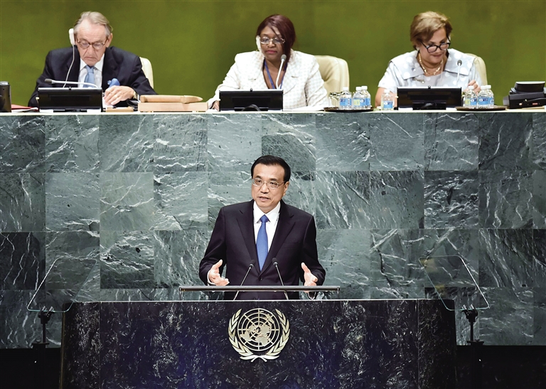 | 2016年9月21日,李克强同志在纽约联合国总部出席第71届联合国大会以“可持续发展目标:共同努力改造我们的世界”为主题的一般性辩论并发表题为《携手建设和平稳定可持续发展的世界》的讲话。 摄影/新华社记者 李 涛 |
