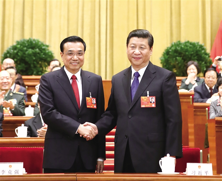 | 2013年3月15日,第十二届全国人民代表大会第一次会议在北京人民大会堂举行第五次全体会议。会议经过投票表决,决定李克强为中华人民共和国国务院总理。这是习近平同志和李克强同志亲切握手。摄影/新华社记者 兰红光 |