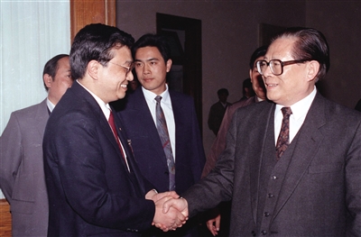 | 1993年5月3日下午,中国共产主义青年团第十三次全国代表大会在北京人民大会堂开幕。在5月3日上午的预备会议后,举行第一次主席团会议,推选李克强等同志为主席团常务主席。这是江泽民同志与李克强同志握手。摄影/新华社记者 郭占英 |
