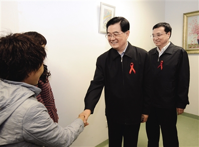 | 2008年12月1日是第21个世界艾滋病日。胡锦涛同志和李克强同志来到北京地坛医院考察艾滋病防治工作。