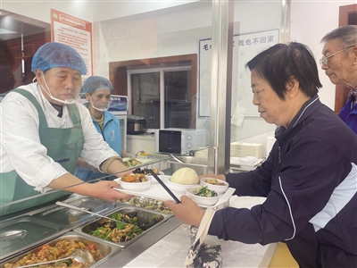 当日11时30分,餐厅正式开餐,老人们刷卡付费后,排队取餐。“您好,主食要米饭、馒头还是花卷?”认真询问后,工作人员将盛有猪肉丸子炖豆腐、过油肉炒青椒、烧茄子、豆芽粉的餐盘递到一位老人手中。