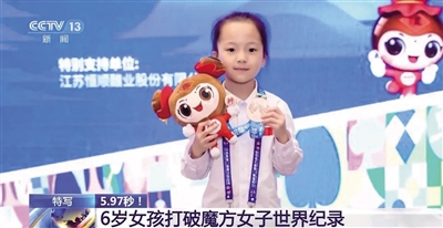 前段时间,在新加坡举行的魔方国际公开赛现场,云集了来自全世界的魔方高手。经过五轮激烈比拼,来自江苏海安的曹岂娴发挥始终稳定、出色。按照规则,去掉最佳成绩和最差成绩,其余3次成绩取平均值后,曹岂娴以5秒97的成绩夺冠,打破世界纪录。