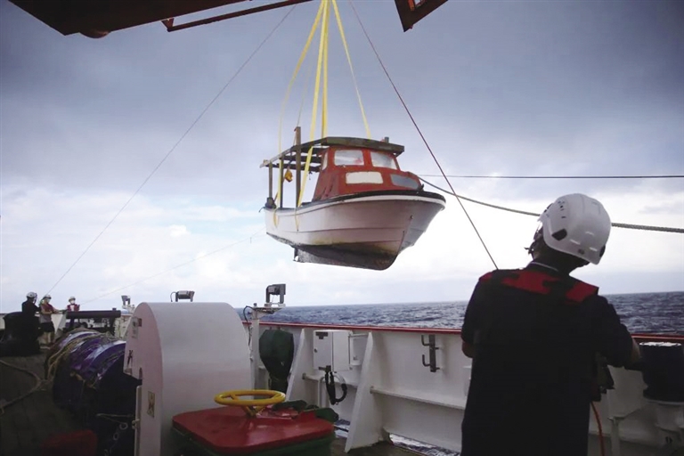 每一次“雪龙2”号穿越赤道,船上都会举行传统纪念活动拔河。11月10日,就在大家都沉浸在比赛中时,驾驶室值班人员突然发现了异常情况。“在很远的地方发现了一个小黑点,靠近后看到有人挥动着黄色衣服,很明显是一个求救的信息。”