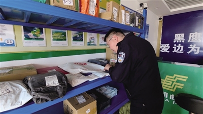 记者日前来到内蒙古出入境边防检查总站阿拉善边境管理支队黑鹰山边境派出所,几十平方米的“爱边为民”边境服务大厅内,靠墙摆放的蓝色钢架格外显眼,上面有序摆放着各类快递件,民警帮前来拿快递的工人翻找着,大厅问询台一半“邮政绿”,一半“藏青蓝”,功能一目了然。