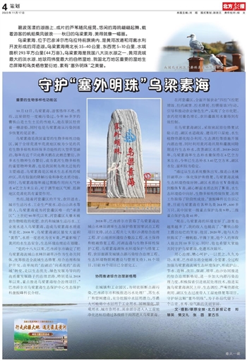 用心治理,精心呵护,一以贯之,久久为功。未来,巴彦淖尔将全地域、全要素、全过程加强乌梁素海流域生态环境保护,形成护山、节水、造林、改田、保湖、增草、治沙协同推进的综合治理新格局,进一步加大内源污染治理力度。积极探索引进底泥处理技术,推进实施乌梁素海渔民上岸、生态调控、芦苇资源化利用、湖区生态过渡带人工湿地修复等项目,守护好这颗“塞外明珠”,为子孙后代留下一个山青、水秀、空气新的美丽家园。 文·摄影/草原全媒·北方新报记者 郑慧英 樊文礼 张 圆 蒙古乐