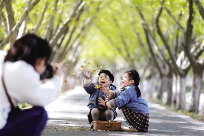 11月18日,小朋友在江苏省扬州市江都区一处公园的“银杏大道”上拍照留念。 初冬时节,各地色彩缤纷,景色如画。 (据新华社报道)