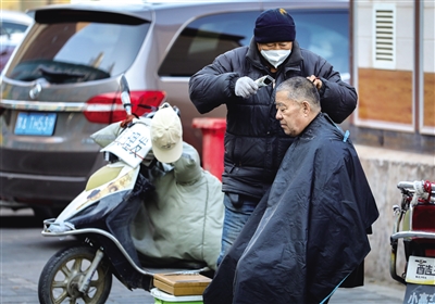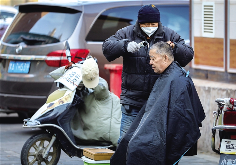 陶利街希望·阳光苑小区附近的早市同样是车水马龙,喧嚣入耳。老手艺人的便民理发摊生意火爆,一把剪刀,一个电推子,老师傅拿着工具的手上下翻飞,片刻功夫一单生意完成。